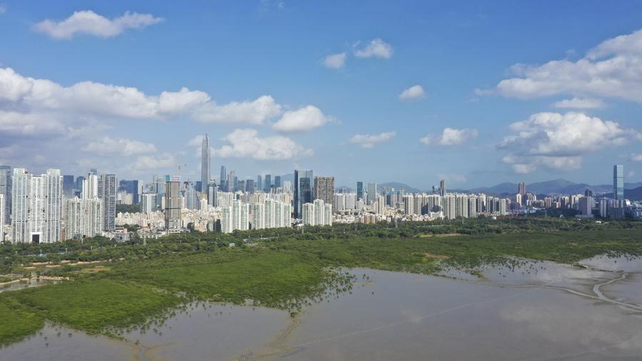 This aerial photo taken on February 1, 2023 shows the view of a mangrove wetland in Futian National Nature Reserve in Shenzhen, South China's Guangdong province. (Xinhua/Liang Xu)