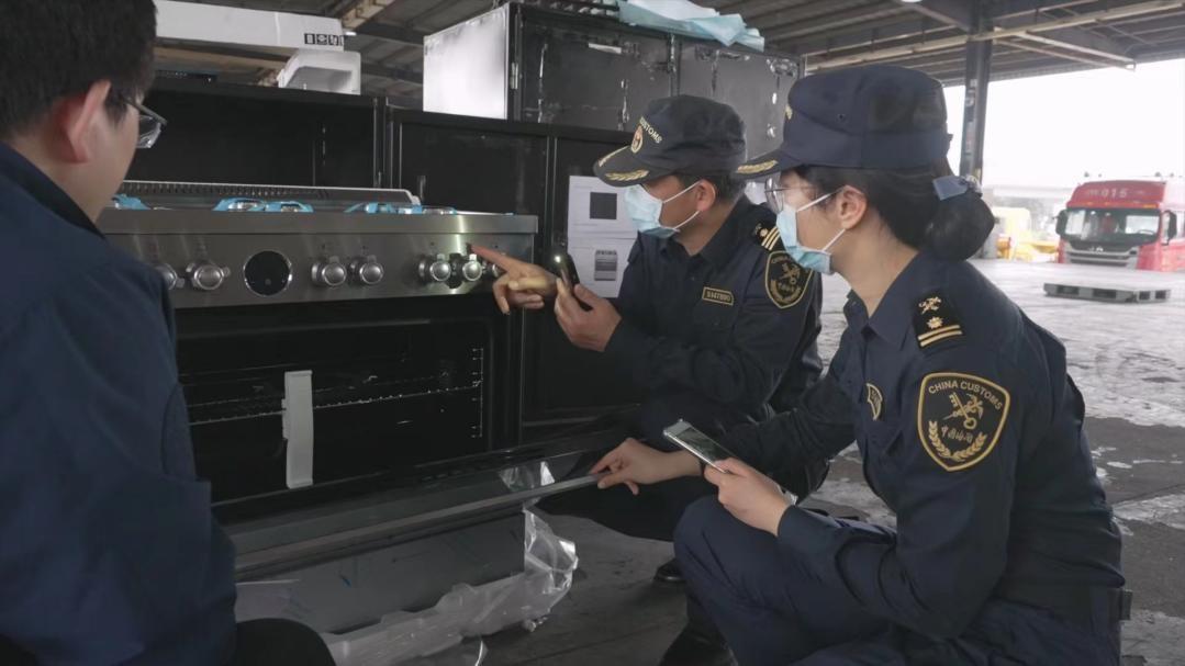 Officials of Guangzhou customs inspect the initial exhibits arriving for the 135th session of the Canton Fair on March 17. (Photo/Han Jianquan)