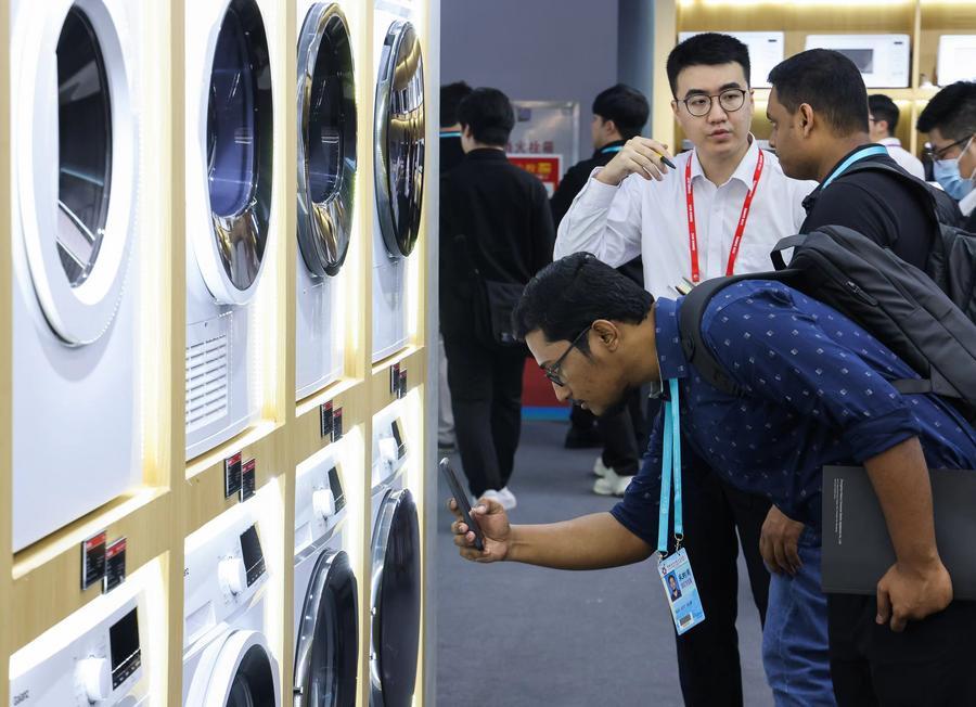 Buyers from Bangladesh learn about household electrical appliances at the 135th session of the China Import and Export Fair, also known as the Canton Fair, in Guangzhou, South China's Guangdong province, April 15, 2024. (Xinhua/Liu Dawei)