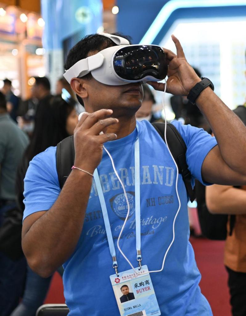 A buyer tries a virtual reality headset at the 135th session of the China Import and Export Fair, also known as the Canton Fair, in Guangzhou, South China's Guangdong province, April 17, 2024. (Xinhua/Deng Hua)