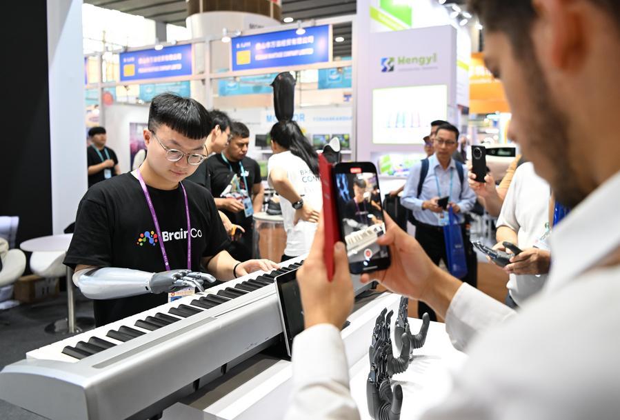 An exhibitor wearing a bionic arm plays electronic keyboard at the 135th session of the China Import and Export Fair, also known as the Canton Fair, in Guangzhou, South China's Guangdong province, April 17, 2024. (Xinhua/Deng Hua)