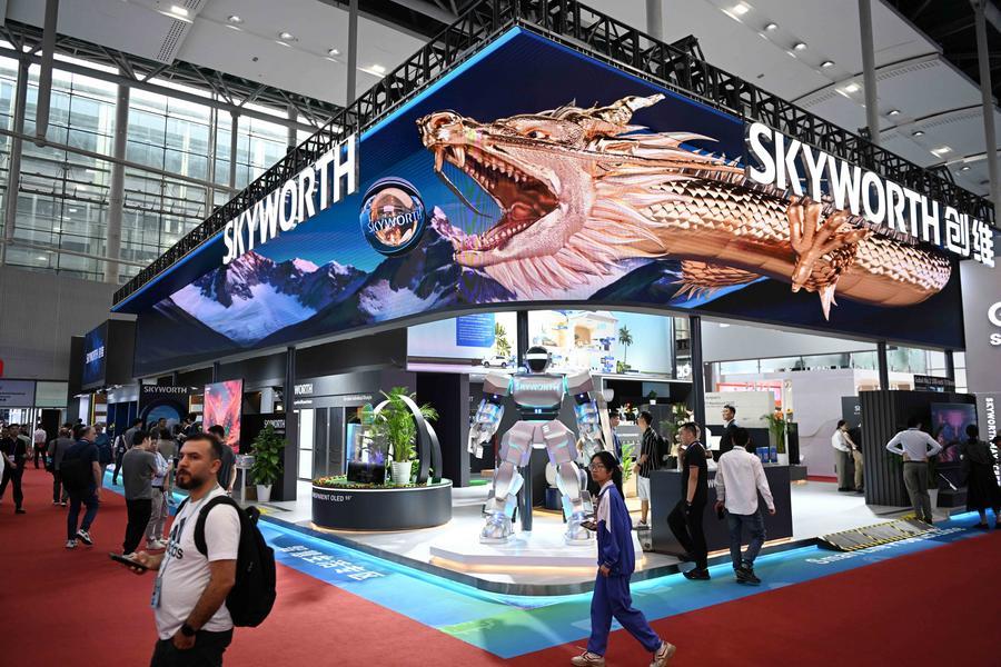 This photo taken on April 17, 2024 shows a booth of Skyworth at the 135th session of the China Import and Export Fair, also known as the Canton Fair, in Guangzhou, South China's Guangdong province. (Xinhua/Deng Hua)