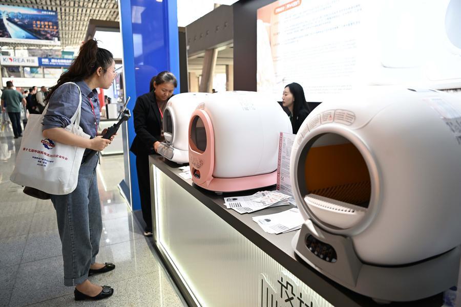A visitor learns about smart cat litter box at the 135th session of the China Import and Export Fair, also known as the Canton Fair, in Guangzhou, South China's Guangdong province, April 17, 2024. (Xinhua/Deng Hua)