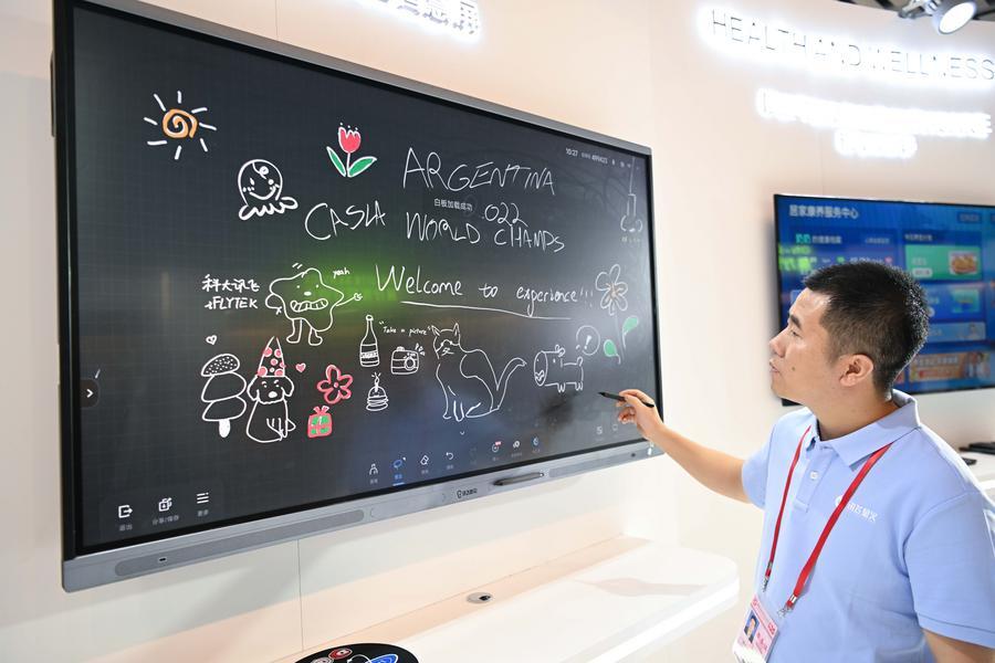 A staff member of iFLYTEK displays a smart screen at the 135th session of the China Import and Export Fair, also known as the Canton Fair, in Guangzhou, South China's Guangdong province, April 17, 2024. (Xinhua/Deng Hua)