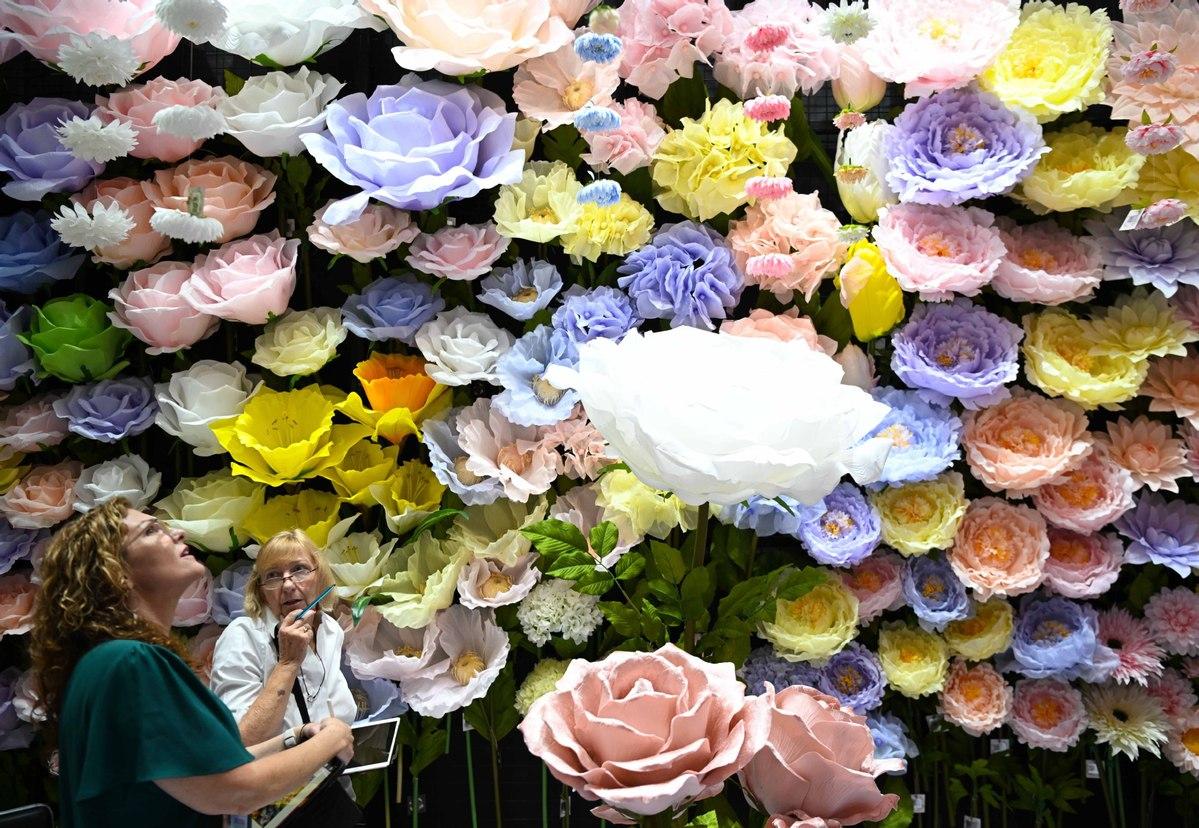 Purchasers talk at a booth of artificial flowers at the second phase of the 135th Canton Fair in Guangzhou, South China's Guangdong province, April 23, 2024. (Photo/Xinhua)