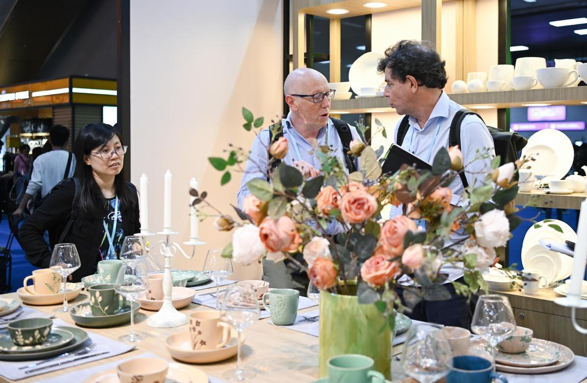 Purchasers talk at a booth of tableware at the second phase of the 135th Canton Fair in Guangzhou, South China's Guangdong province, April 23, 2024. (Photo/Xinhua)