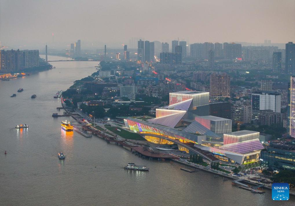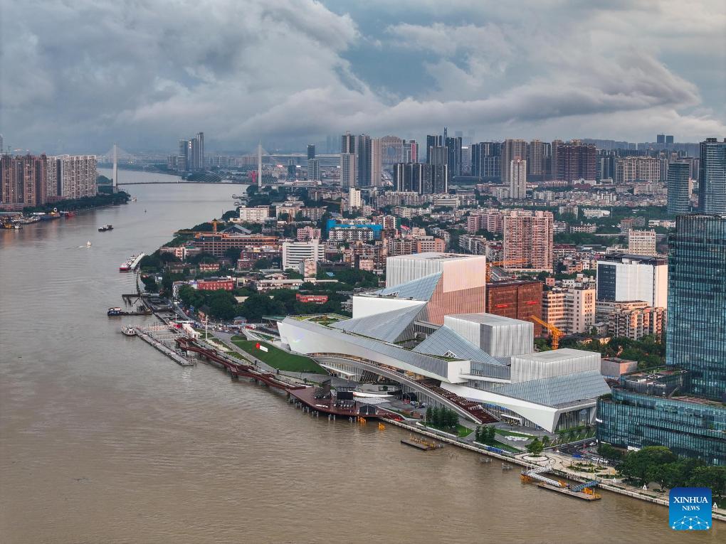 An aerial drone photo taken on April 26, 2024 shows an exterior view of the Bai'etan Greater Bay Area Art Center in Guangzhou, South China's Guangdong province. (Xinhua/Liu Dawei)