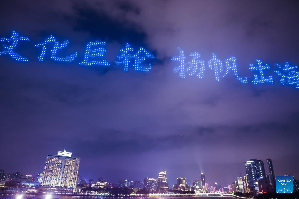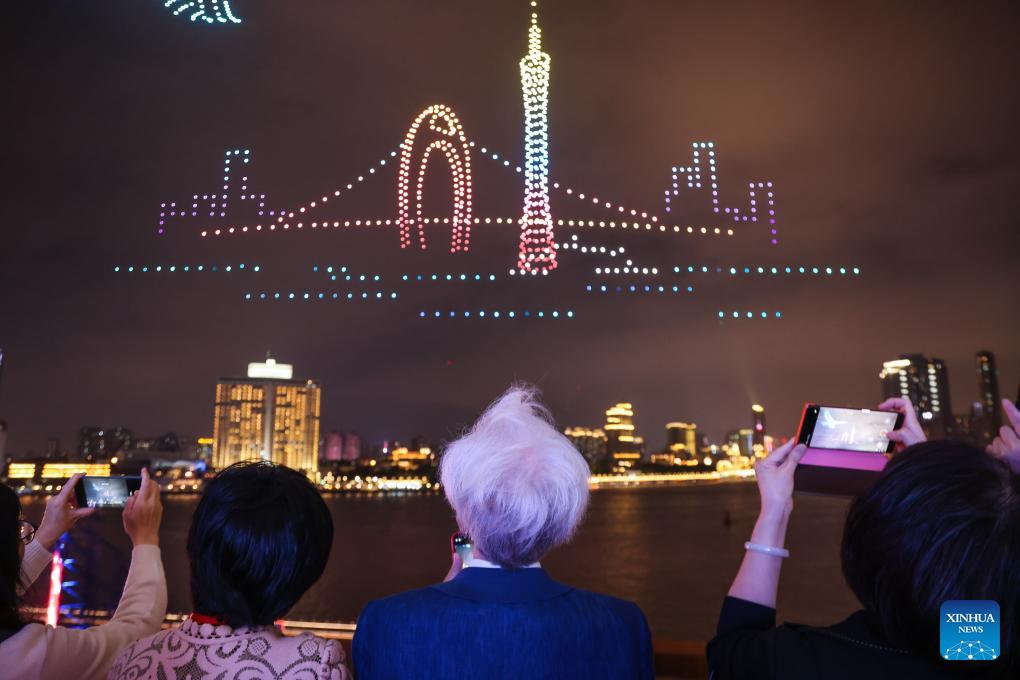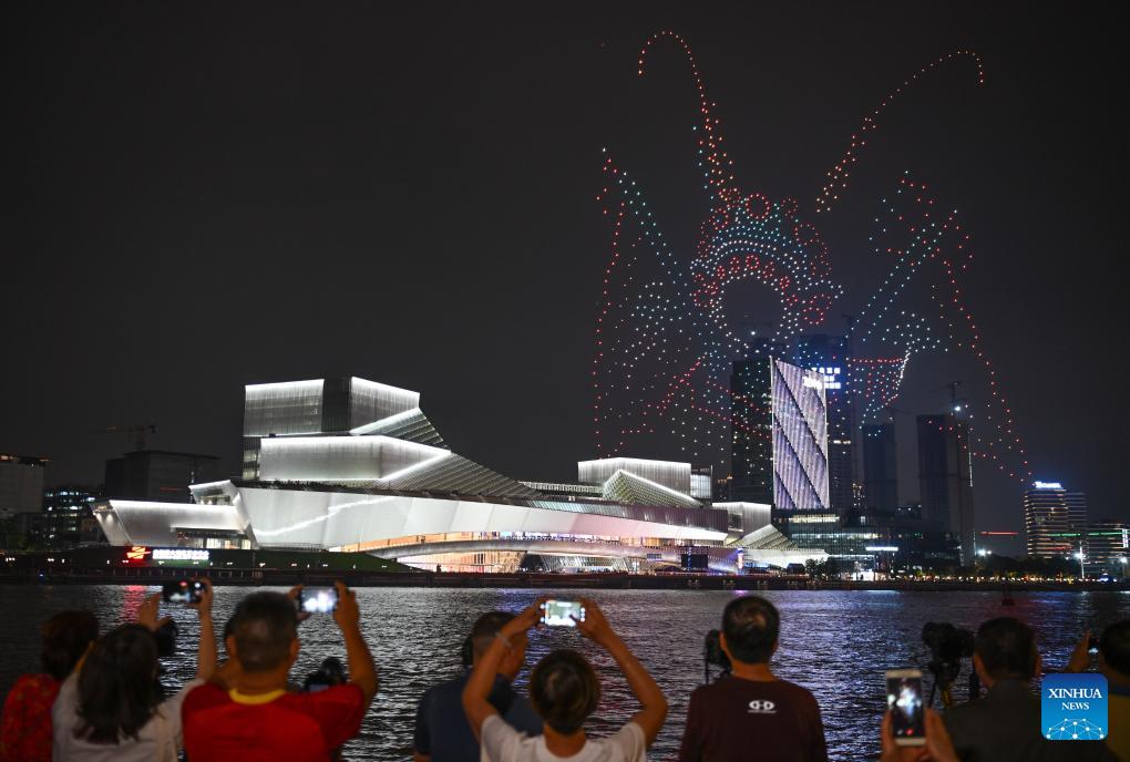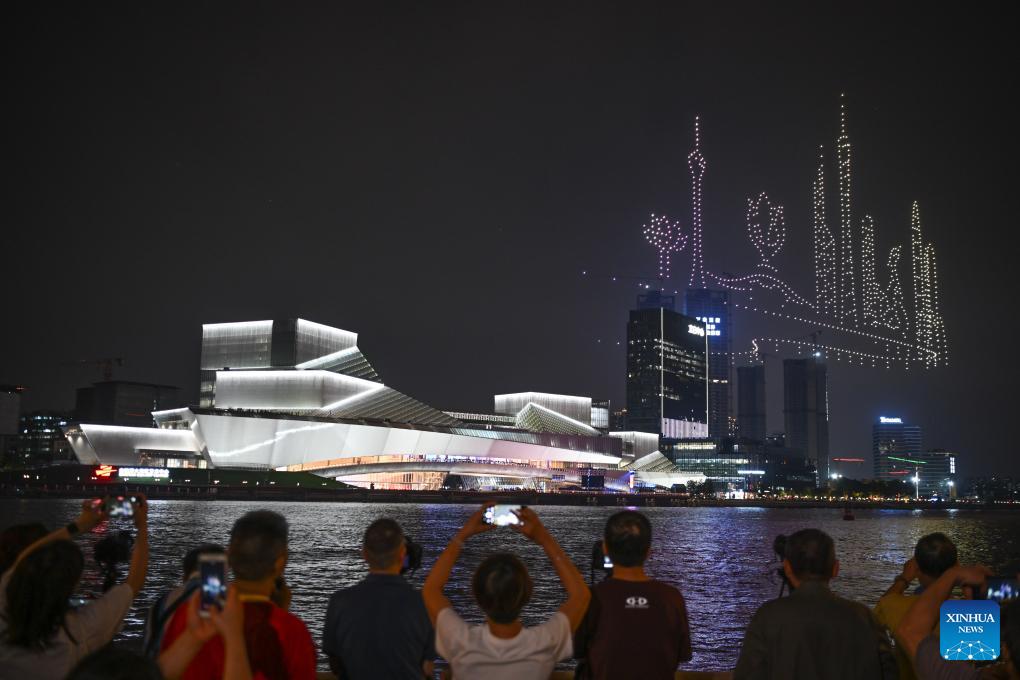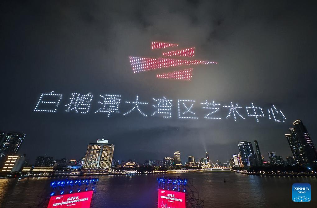 A drone show is staged around the Bai'etan Greater Bay Area Art Center in Guangzhou, South China's Guangdong province, April 28, 2024. (Xinhua/Liu Dawei)