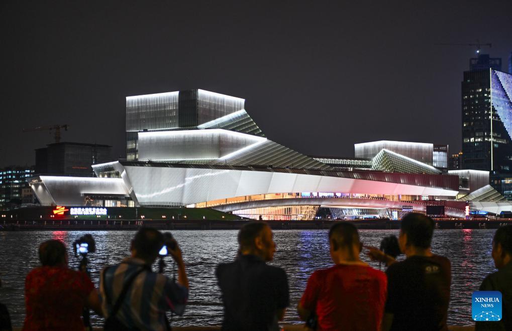 A light show is staged at the Bai'etan Greater Bay Area Art Center in Guangzhou, South China's Guangdong province, April 28, 2024. (Xinhua/Deng Hua)