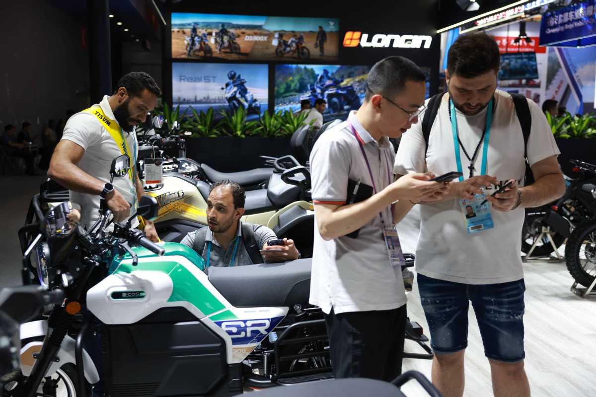 Visitors check out motorcycles displayed during the 135th China Import and Export Fair, also known as the Canton Fair, in Guangzhou, Guangdong province, in April. (Feng Yongbin/China Daily)