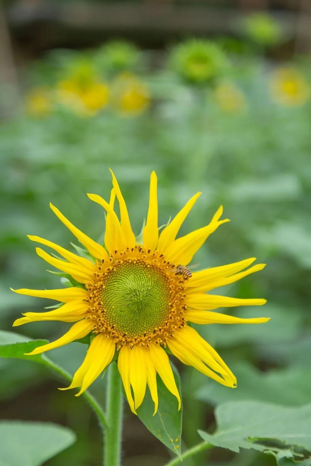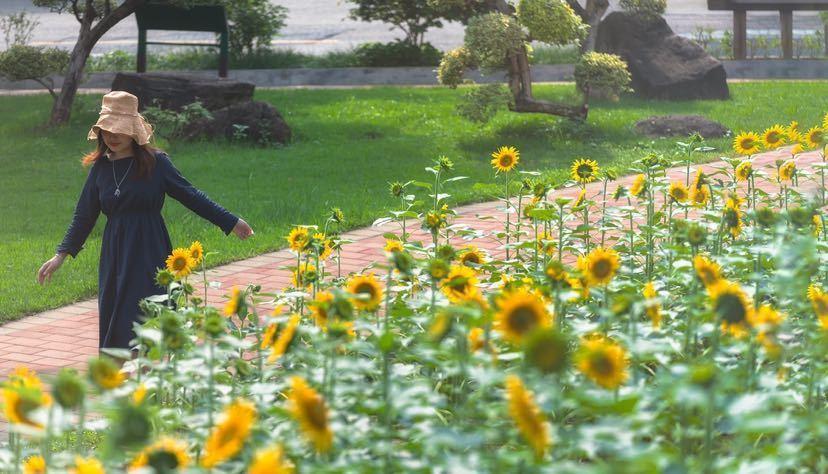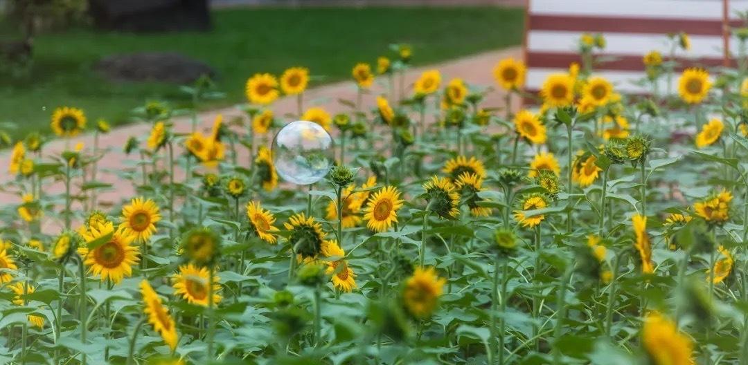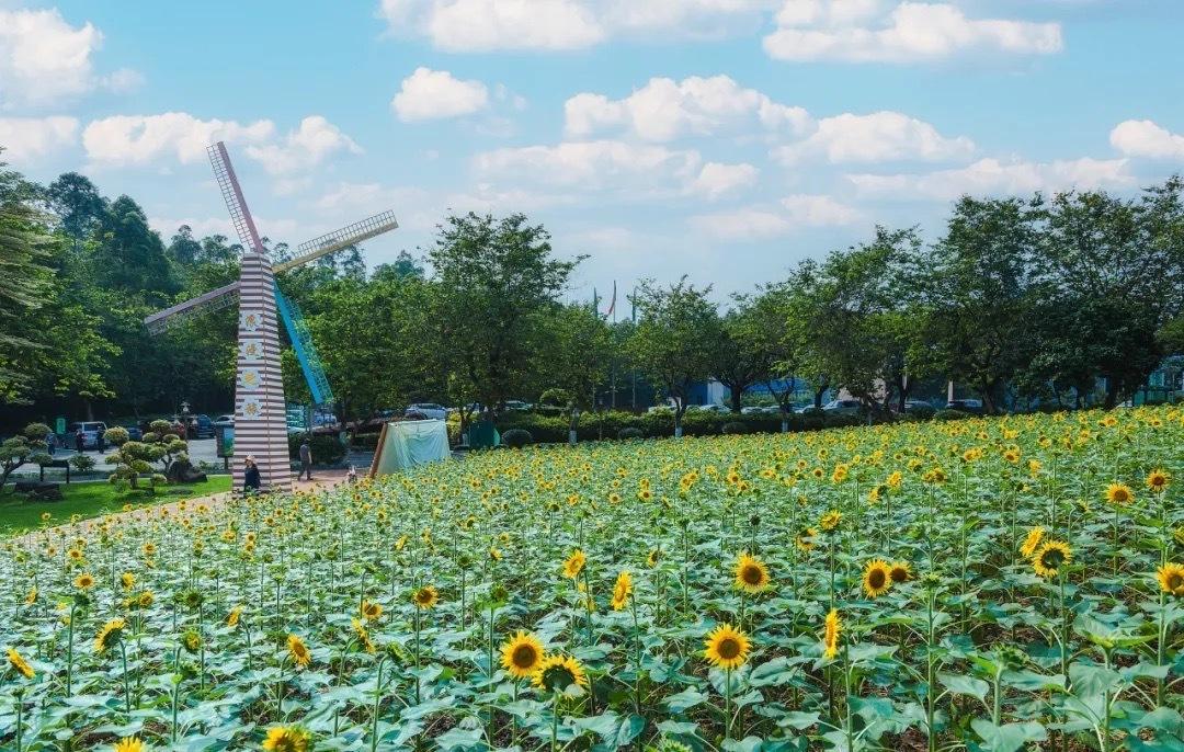 The vast and lush sunflower field is matched by a big windmill and the blue sky on fine days, which together constitute an idyllic landscape painting that is full of vitality.