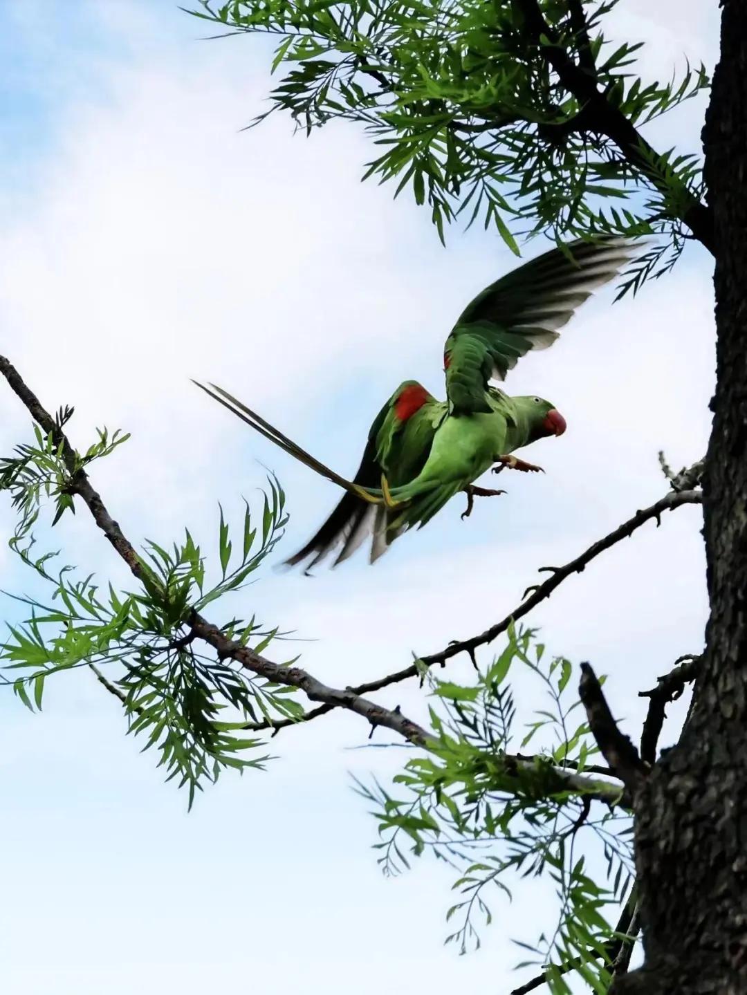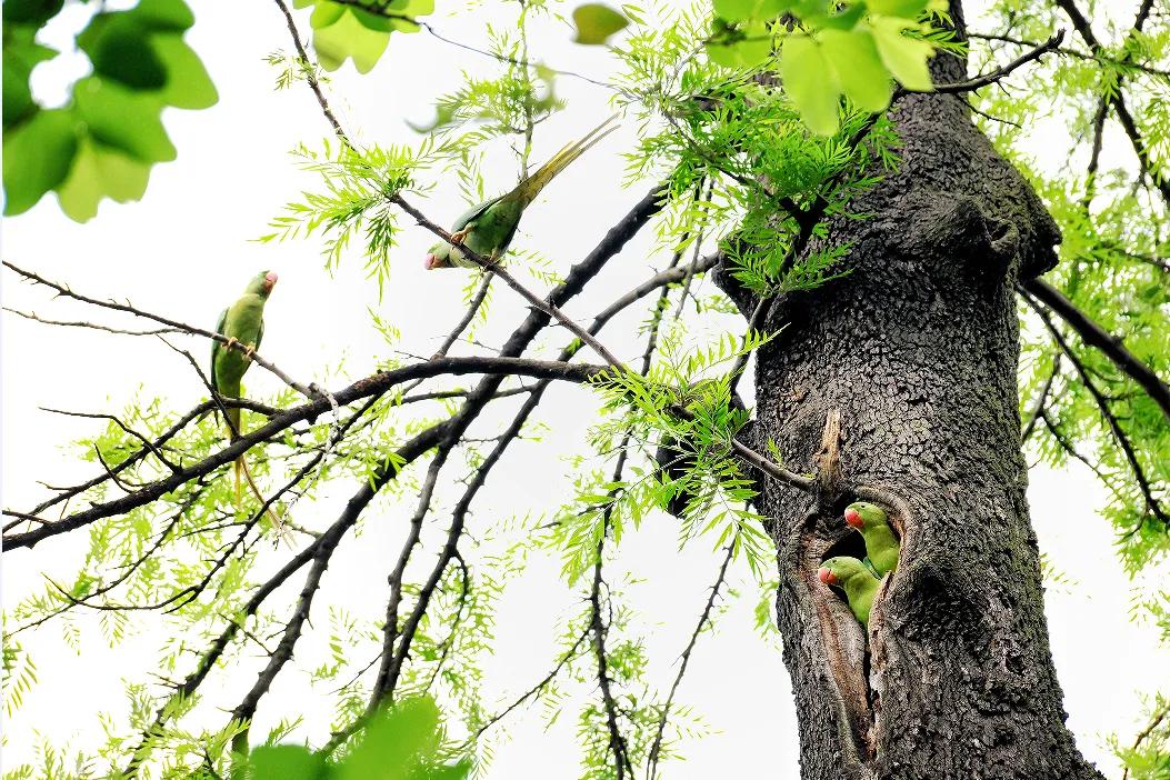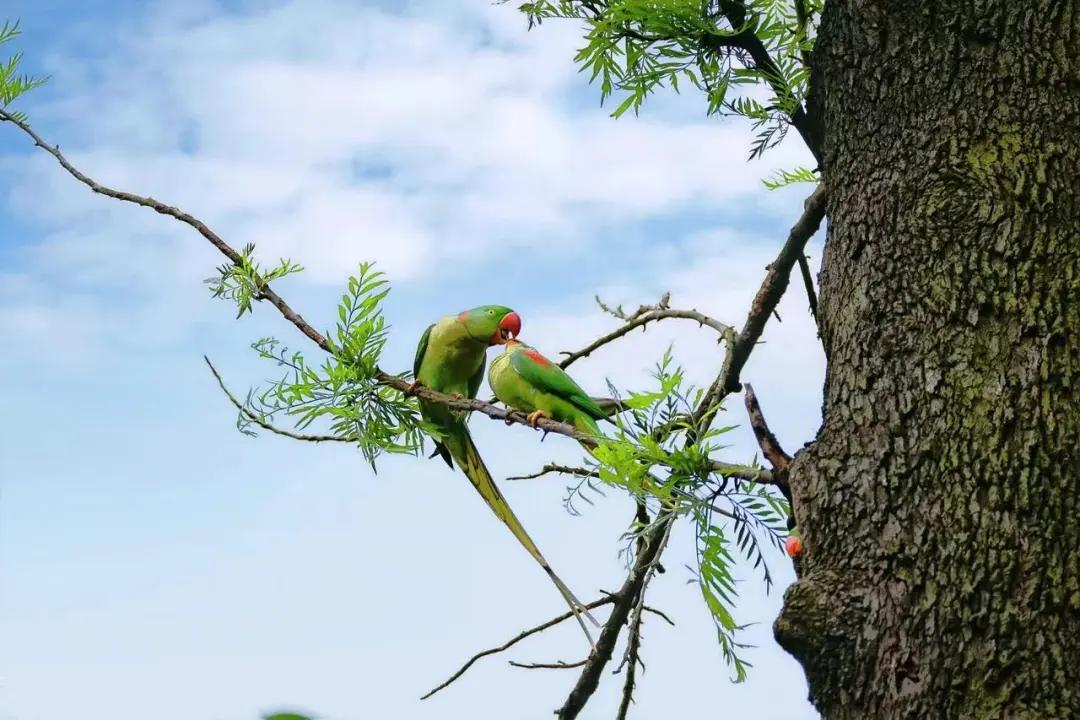 Alexandrine parrots, classified as second-class protected wildlife in the National Key Protected Wildlife List, can be frequently observed in Liuhua Lake Park in downtown Guangzhou. With vibrant green and blue feathers and the ability to mimic human language, they are favored by many photographers and citizens.
