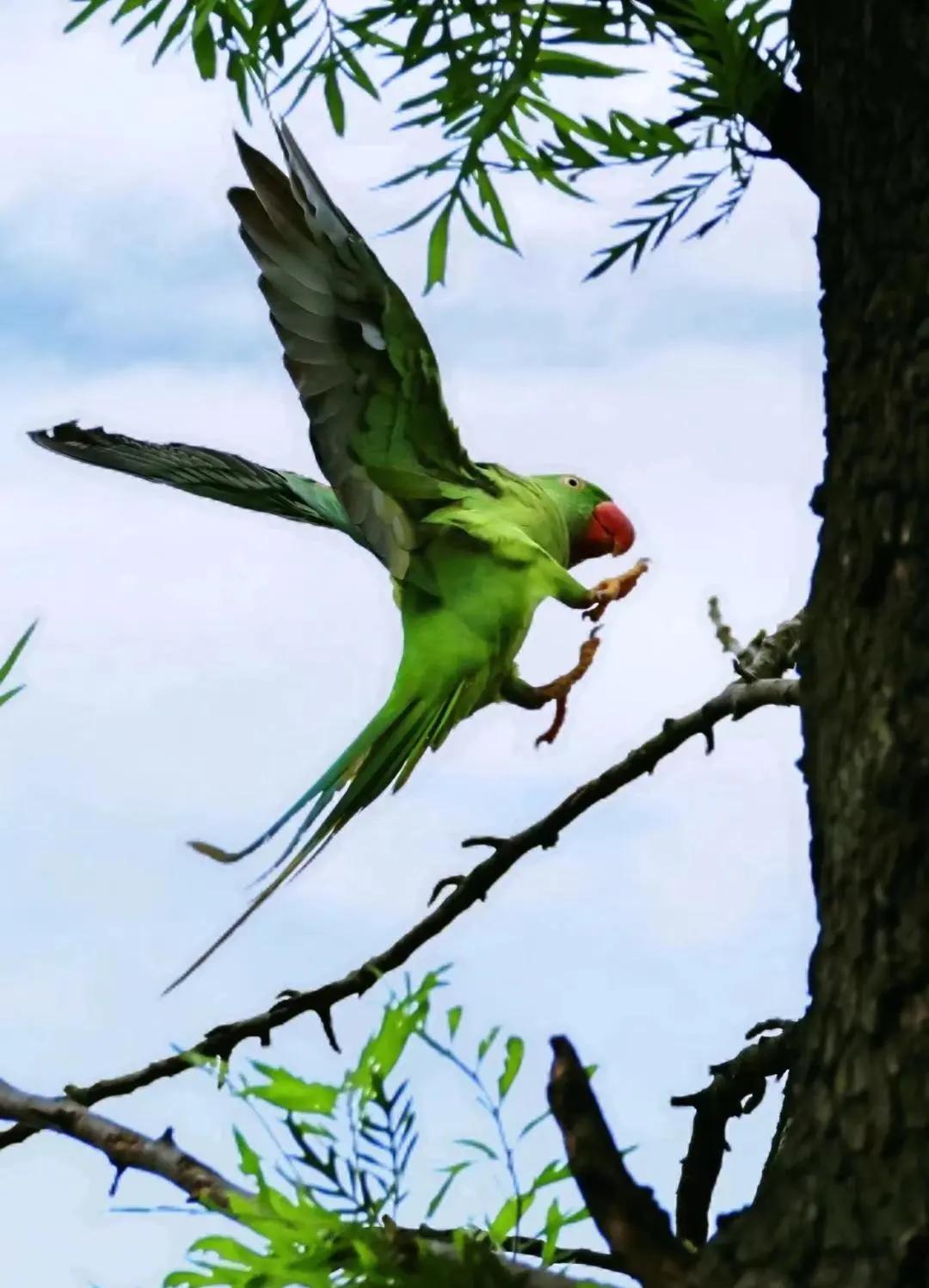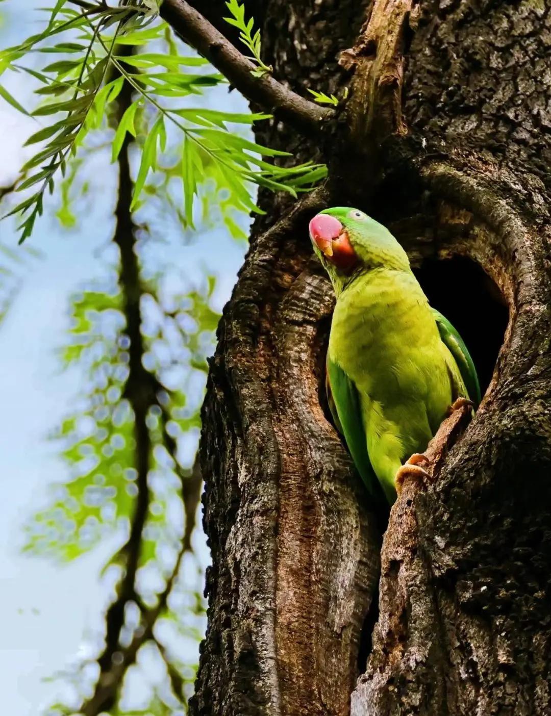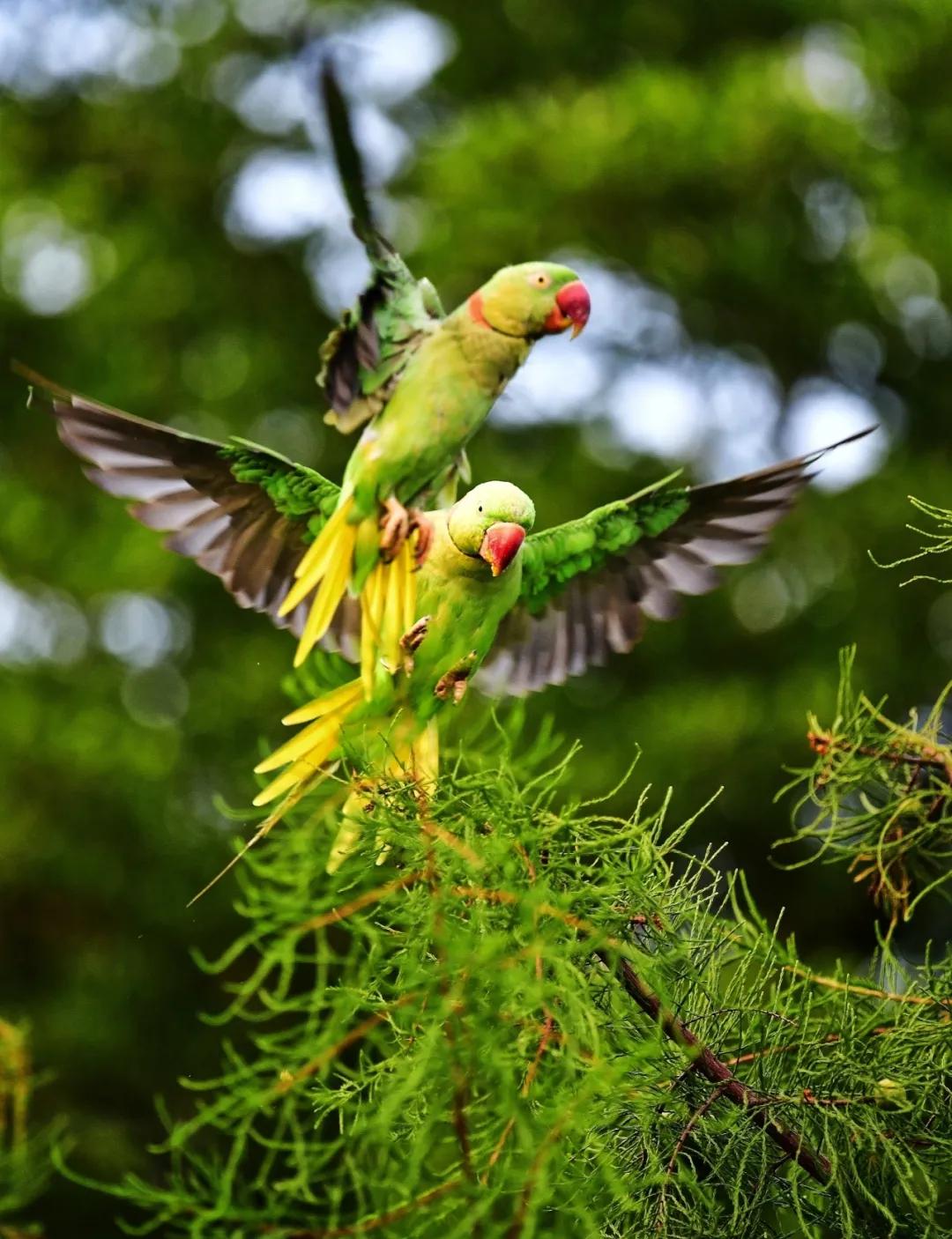 Alexandrine parrots, classified as second-class protected wildlife in the National Key Protected Wildlife List, can be frequently observed in Liuhua Lake Park in downtown Guangzhou. With vibrant green and blue feathers and the ability to mimic human language, they are favored by many photographers and citizens.