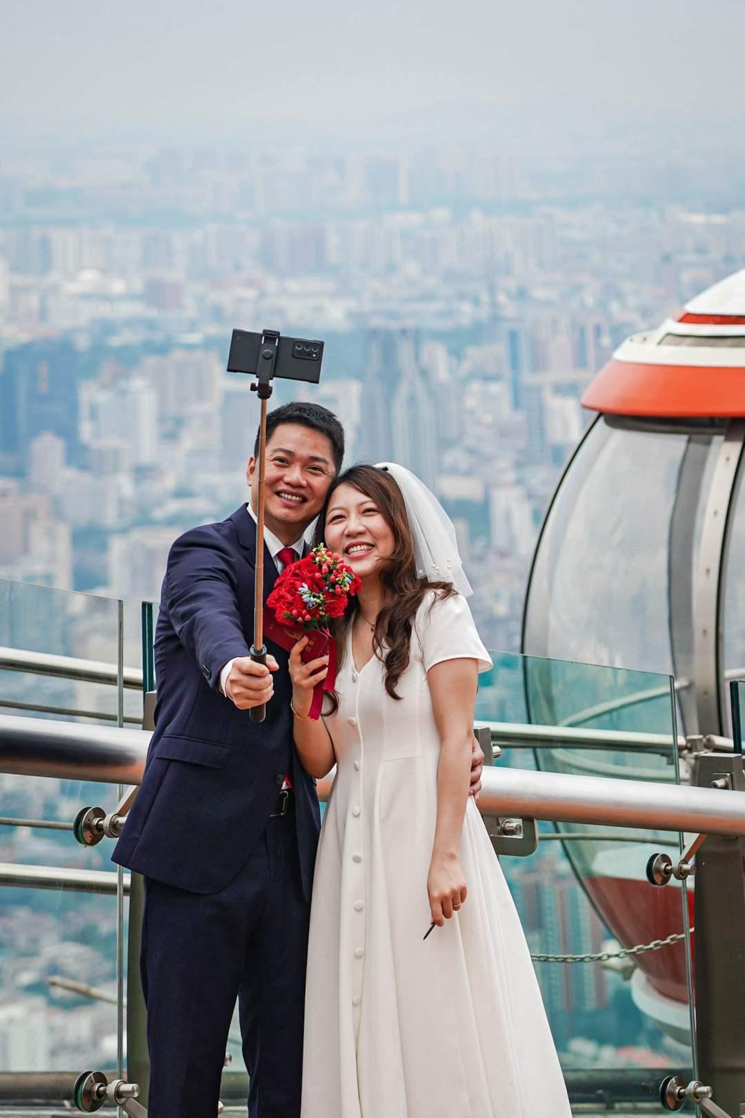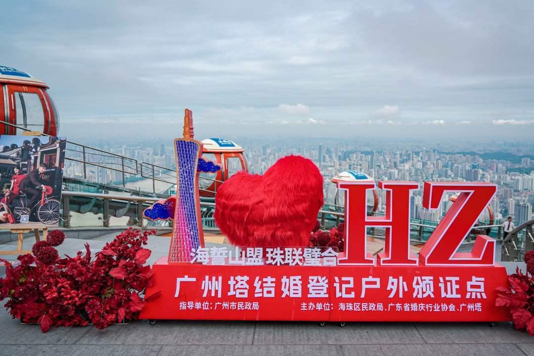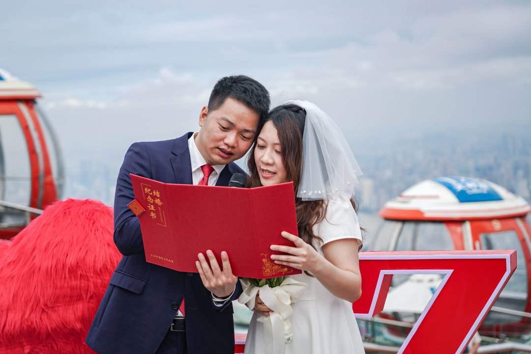 On May 22, Guangzhou couple Mr. and Mrs. Dai happily tied knot at an altitude of 450 meters at the Canton Tower, where an official outdoor marriage registration point was launched at the same day, the highest of its kind in China.