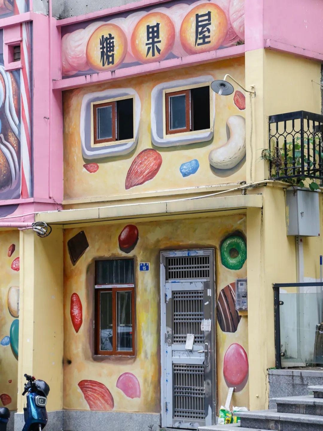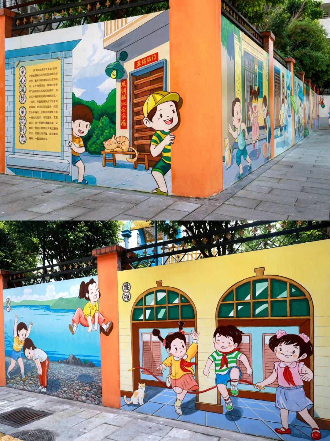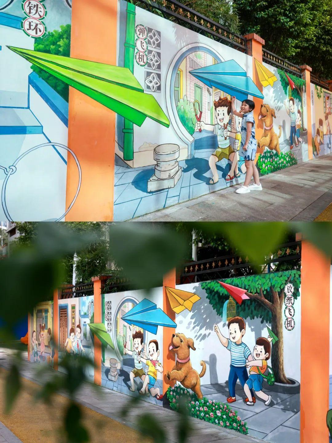 A 200-meter street is decorated with colorful wall paintings depicting fun children's games, such as making paper airplanes, jumping ropes, playing hopscotch, and playing glass balls. They remind visitors of their sweet childhood memories.