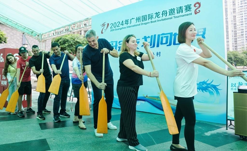 On June 9, a group of foreigners participated in a promotion activity of the Guangzhou International Dragon Boat Invitational Tournament 2024 to be held on June 16 at Guangzhou's Liede village.