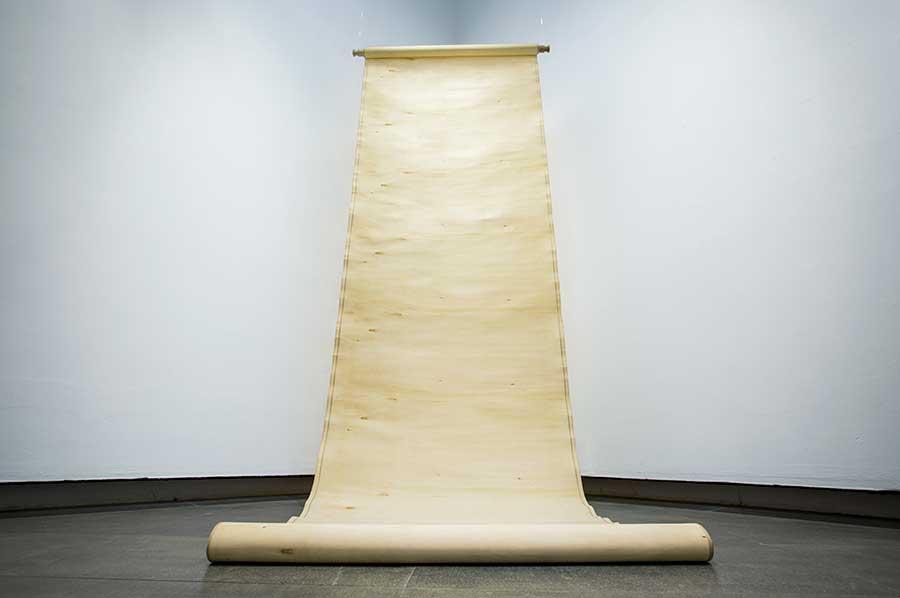 Photo shows Guo Gong's installation Paper Scroll, which is made of wood. (Photo provided to China Daily)