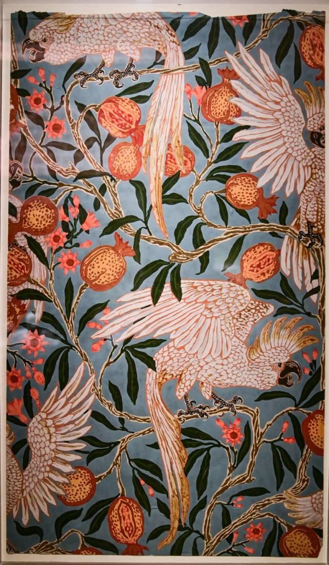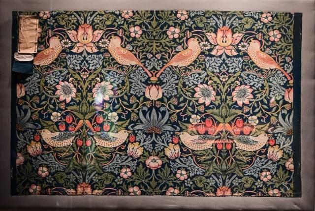 One of the best-known exhibits must be Strawberry Thief, a textile with pattern inspired by birds stealing strawberries from Morris's garden. To perfect the color and clearness, he adopted the indigo dye and added cochineal, alizarin red and yellow extracted from mignonette.
