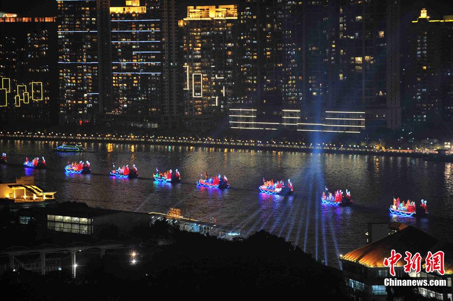 Forty-six boats carrying athlete delegations and officials of the Olympic Council of Asia paraded through the Pearl River, warmly greeted by rousing cheers from hundreds of thousands of spectators watching from both banks of the river. They finally arrived at the Haixinsha island, the main opening venue of the Games that was designed in the shape of a giant vessel.