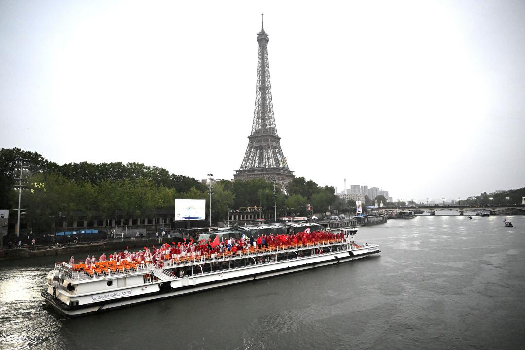 The boat carrying members of the delegations from Cameroon, Canada, Central African Republic, Chile and China passes by the Eiffel Tower during the opening ceremony of the Paris 2024 Olympic Games in Paris, France, July 26, 2024. (Photo/Xinhua)