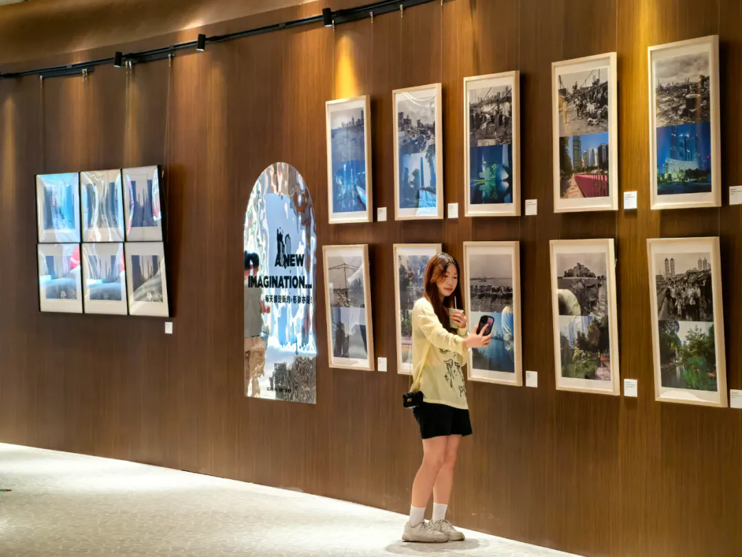 A visitor takes selfies before the photography works that showcase the past and present of Zhujiang New Town, the central urban area in Tianhe district.