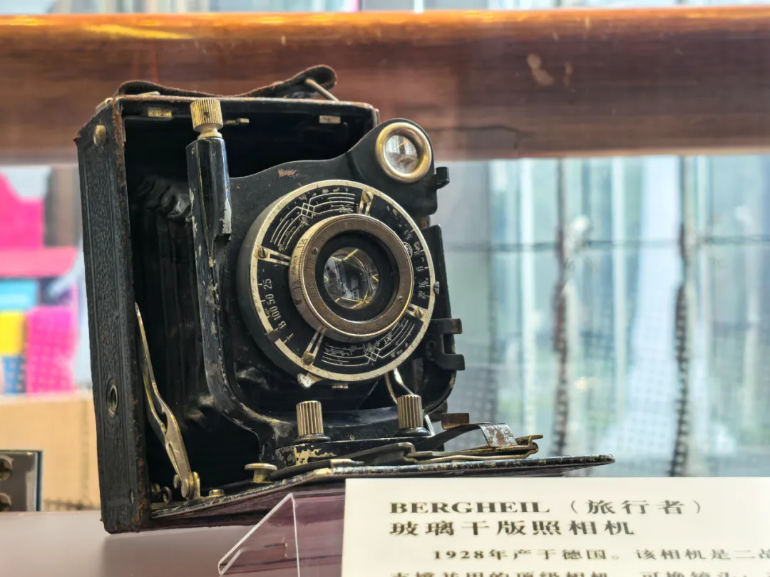 The Bergheil glass plate camera is displayed at the exhibition. Produced in Germany in 1928, it was the top handheld and tripod-supported camera during World War II. It is now collected at the Wenshi Cultural Archive Museum in Guangdong province.