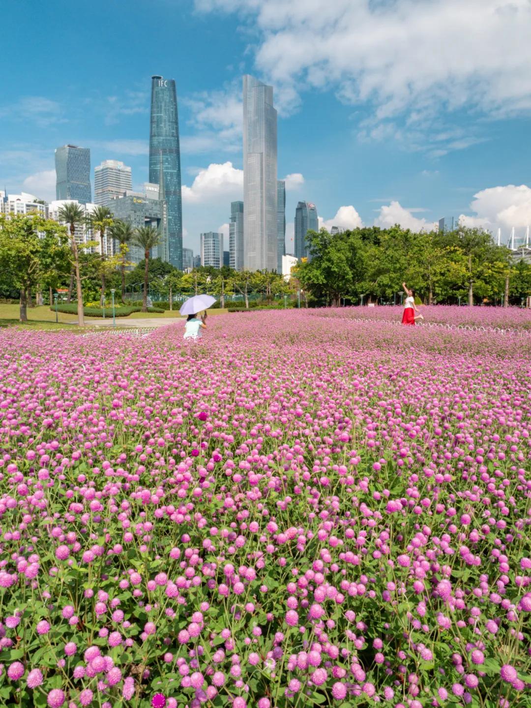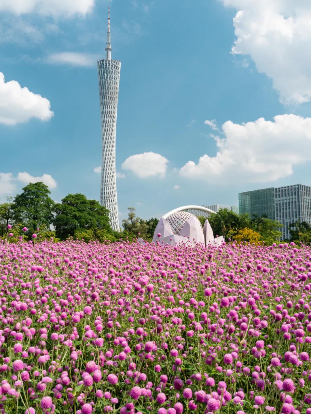 The globe amaranth flowers, also known as gomphrena globosa, have formed a magnificent sea of pink in Hongcheng Park on Ersha Island in Guangzhou. The park is a popular destination for tourists, who come to stroll through the park and take pictures with the iconic Canton Tower as a backdrop.