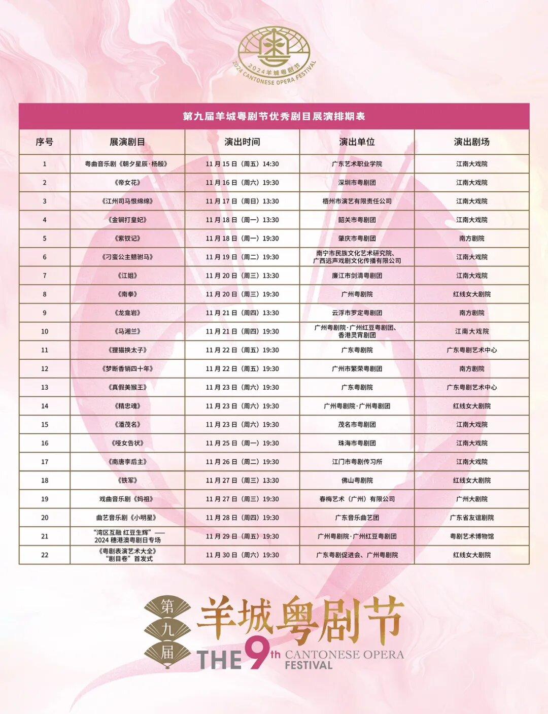 The performances will be held at various venues, including the Guangzhou Opera House, the Hung Sin-Nui Grand Theater, the Guangdong Friendship Theater, the Guangdong Cantonese Opera Art Center, the Guangzhou Jiangnan Grand Theater, the Southern Theater, the Red Bean Hall of the Guangzhou Cantonese Theater, and the Cantonese Opera Art Museum, covering multiple areas of Guangzhou.