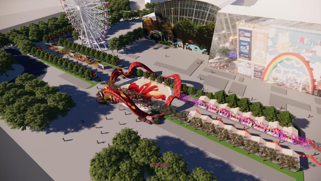 This year's Tianhe flower market incorporates sports elements. The layout of the flower market stalls is designed to resemble a racetrack, and the flower market archway features a sporting ribbon design, echoing the shape of the revamped Guangdong Olympic Sports Center.