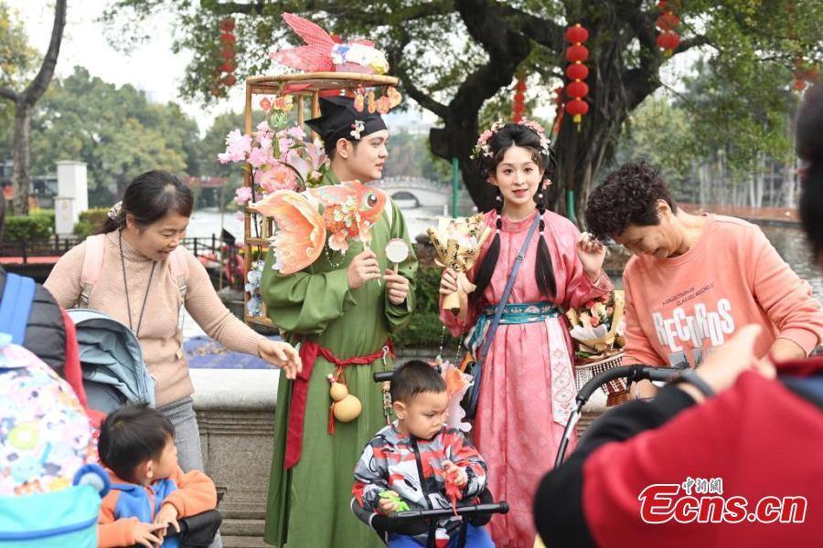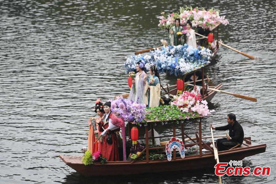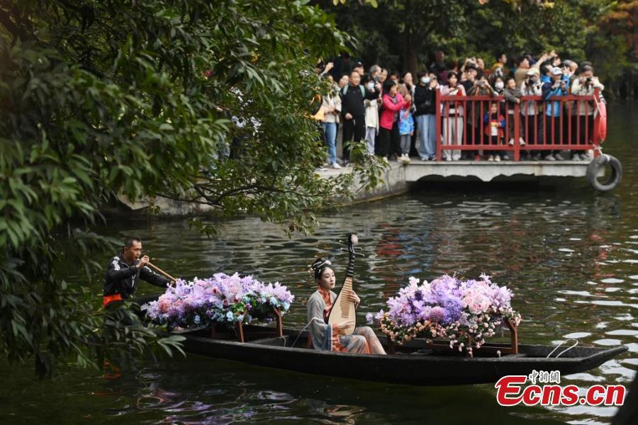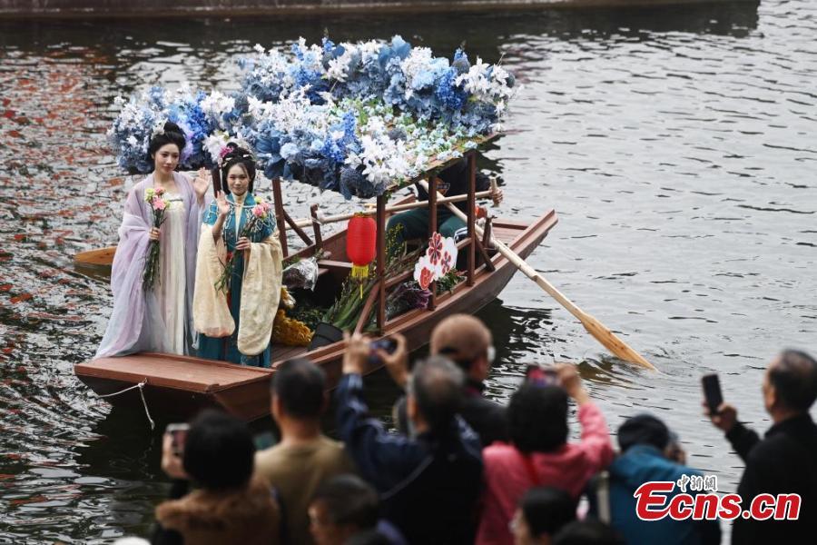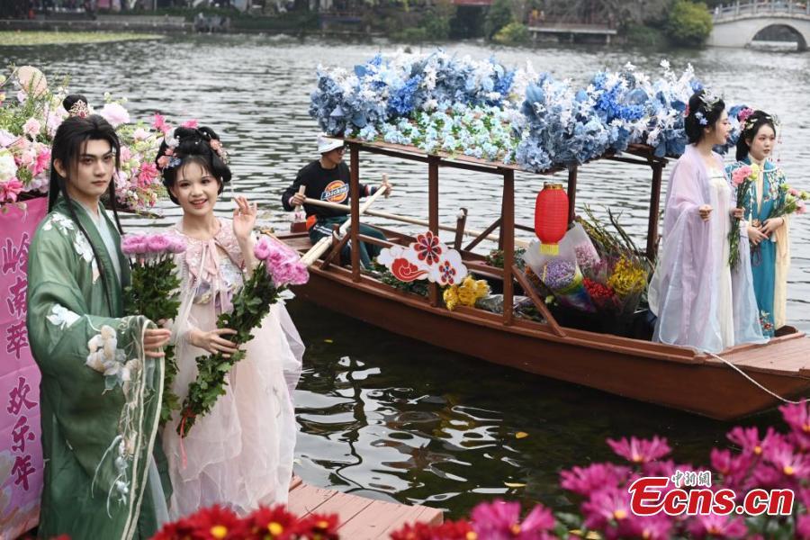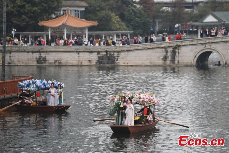 Performers wearing traditional Chinese "hanfu" dresses take boats on Liwan Lake in Guangzhou, South China's Guangdong province, January 22, 2025. (China News Service/Chen Chuhong)
