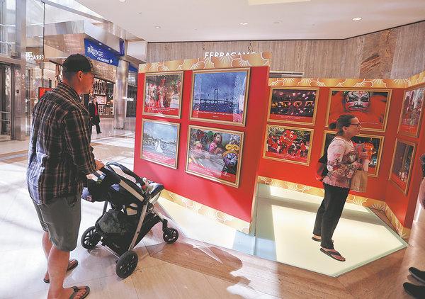 Visitors view photos at an exhibition in South Coast Plaza in Orange County, Southern California, featuring 38 photos by American photographers focusing on the culture of Guangdong province. (Photo/Xinhua)