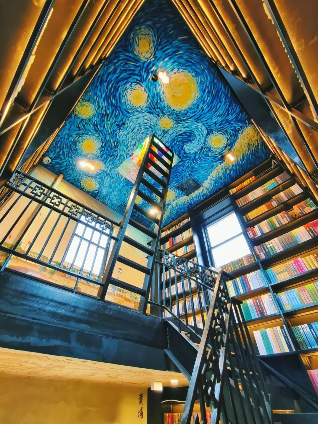 The book tower is black and yellow in colour, and contains over 7,000 books on the Silk Road, marine science, foreign history and literature. A black spiral staircase leads up to the tower's ceiling, where Van Gogh's Starry Night was painted. It evokes a sense of mystery and historical grandeur.