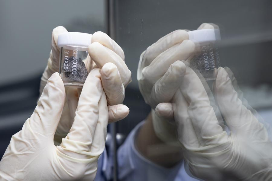 A researcher shows a lunar sample retrieved by the Chang'e 6 mission at the lunar sample laboratory in the National Astronomical Observatories of the Chinese Academy of Sciences (CAS) in Beijing, capital of China, September 24, 2024. (Photo/Xinhua)
