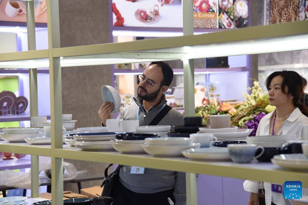 People view porcelain tableware at the second phase of the 138th edition of the Canton Fair in Guangzhou, South China's Guangdong province, October 27, 2025. The second phase of the 138th edition of the Canton Fair, showcasing household goods, gifts, decorations, building materials, and furniture, closed here on October 27.