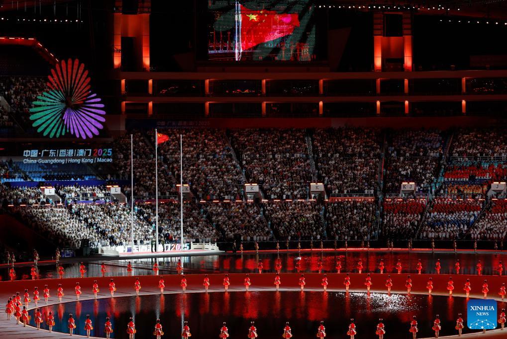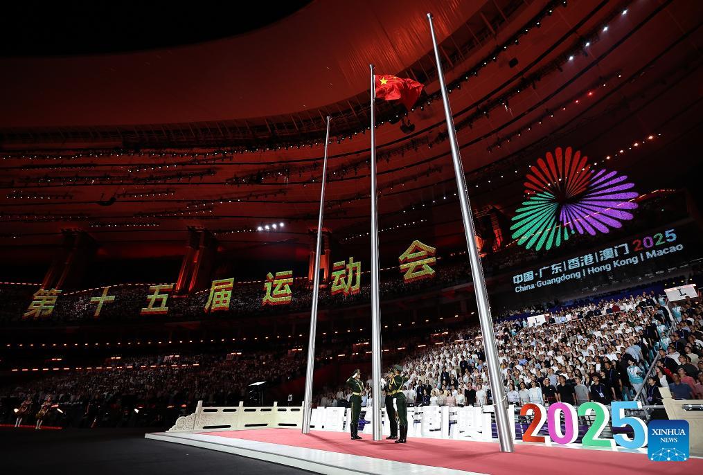 The Chinese national flag is raised during the opening ceremony of China's 15th National Games in Guangzhou, South China's Guangdong province, November 9, 2025. (Xinhua/Pan Yulong)