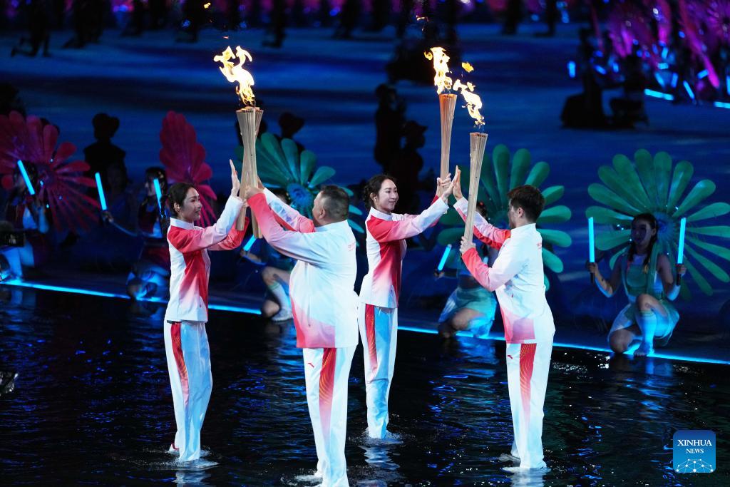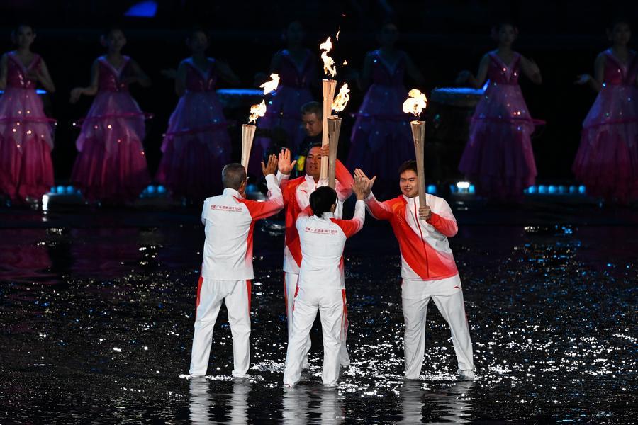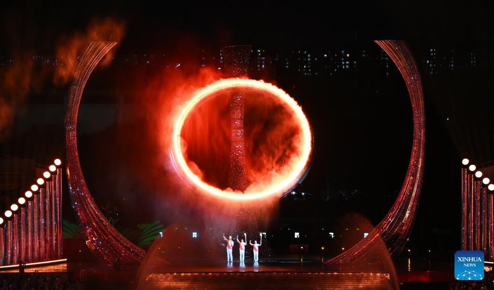 The cauldron is lit during the opening ceremony of China's 15th National Games in Guangzhou, South China's Guangdong province, November 9, 2025. (Xinhua/Hu Huhu)