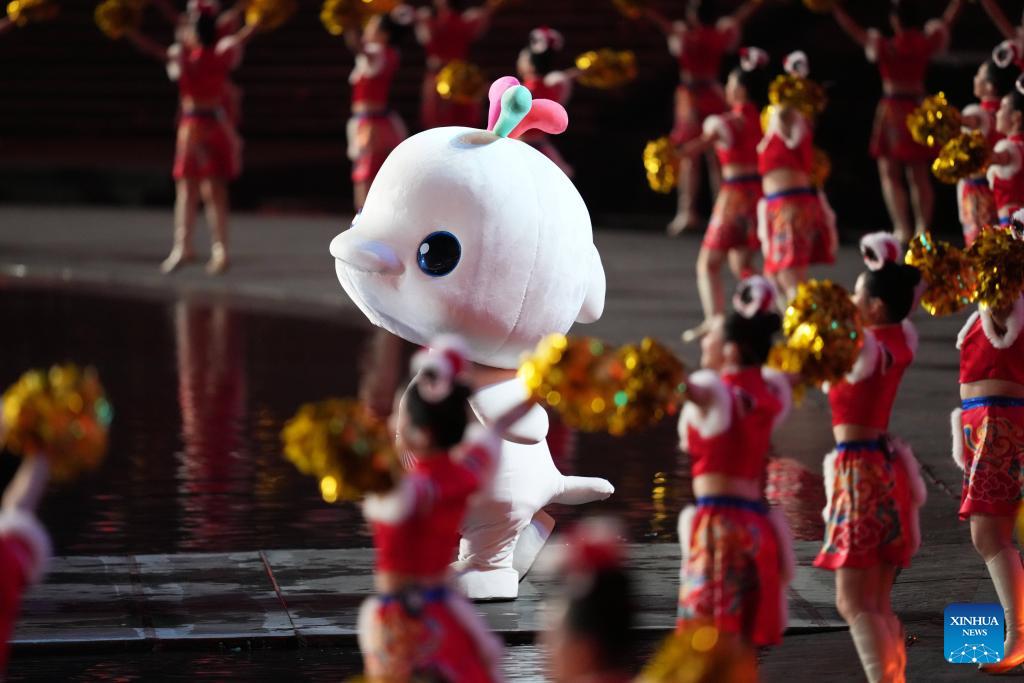 The mascot is seen during the opening ceremony of China's 15th National Games in Guangzhou, South China's Guangdong province, November 9, 2025. (Xinhua/Li Yibo)
