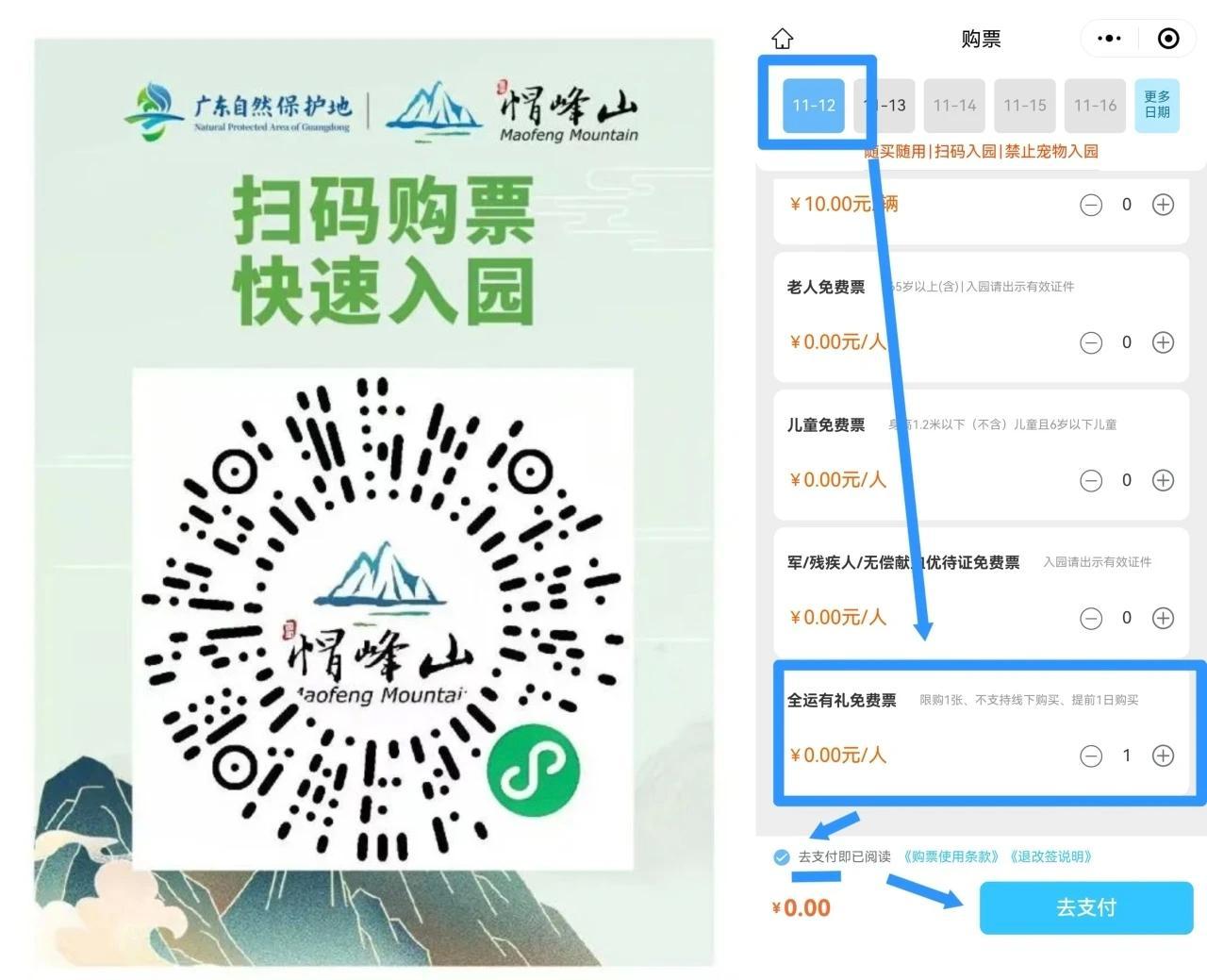 Details: 300 free tickets are available per day. Tickets must be reserved one day in advance by scanning the QR code on the Guangzhou Maofeng Mountain Forest Park (广州市帽峰山森林公园) WeChat official account. One ticket per person/account.