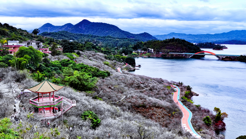 Recently, Guangzhou Plum Blossoms Viewing Season kicked off at Guangzhou Liuxi River National Forest Park. The park features a plum blossom area of 3,000 mu, where nearly 100,000 trees are now in full bloom. Viewed from afar, the blooming plum trees look as if they are covered with snow.