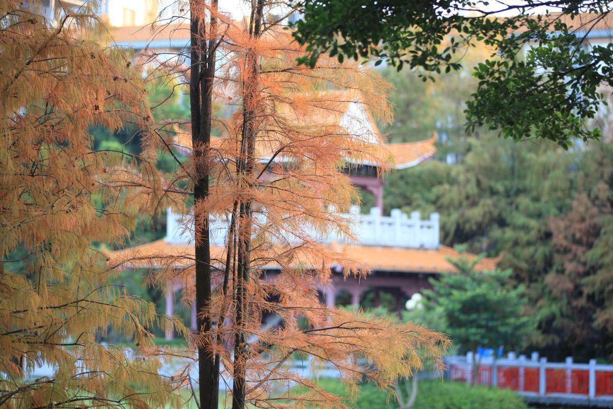 The bald cypress, which is native to North America, is noted for the russet-red color of its needle-like leaves, which first turn yellow in autumn, then turn copper red, and finally fall off in the cold of winter.