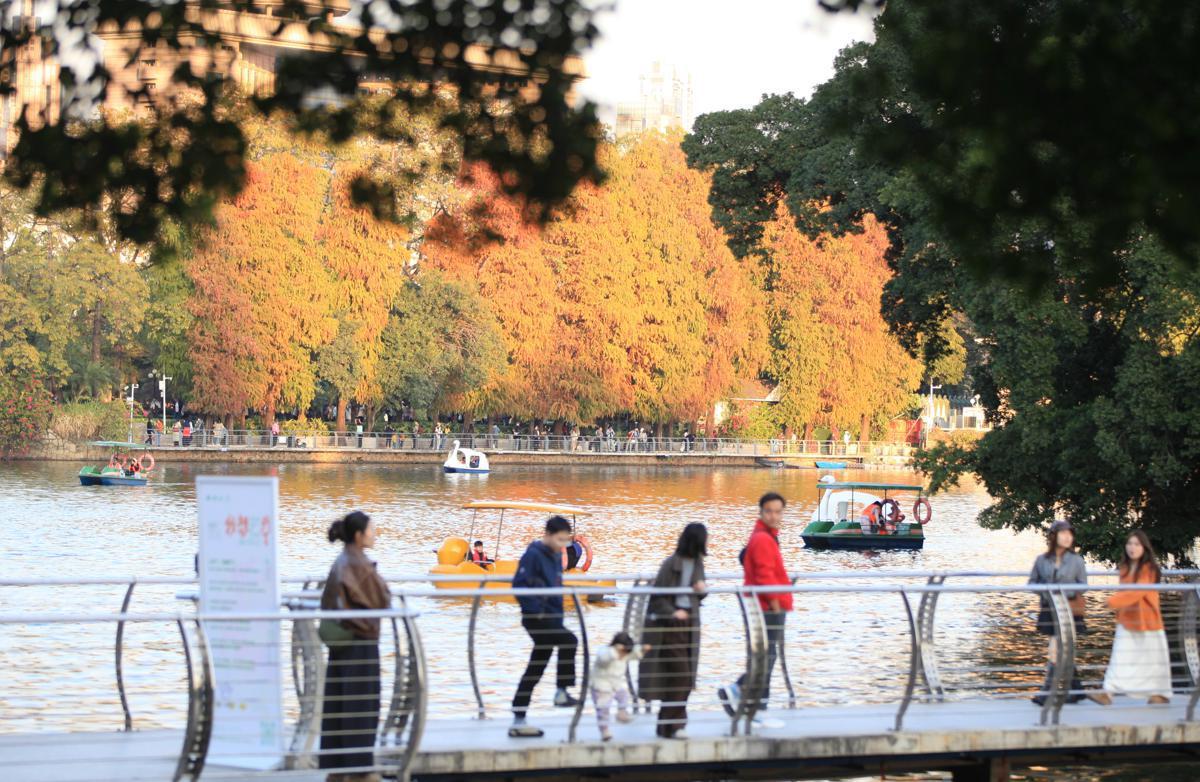 Bald cypress trees around Donghu Lake in Guangzhou, the capital of Guangdong province, have turned red, attracting an increased number of visitors over the weekend. (Photo by Qiu Quanlin/China Daily)