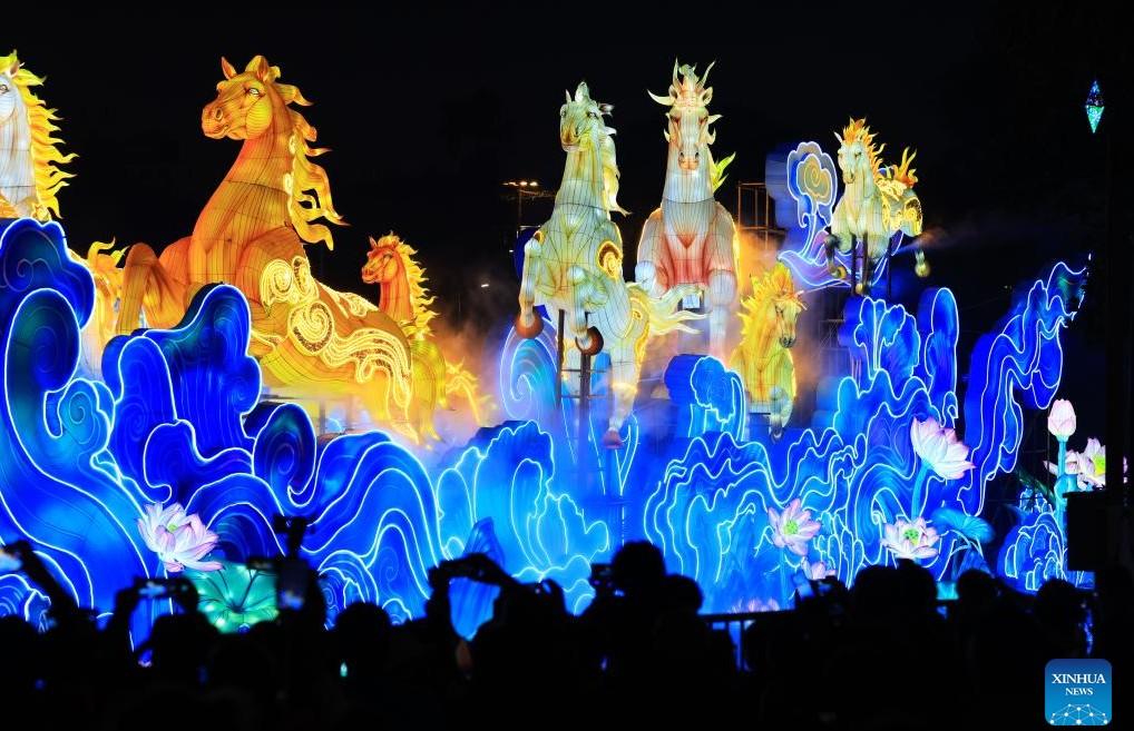 This photo taken on January 30, 2026 shows a set of lanterns inspired by the Chinese zodiac horse during the 2026 Guangzhou Spring Festival lantern show in Guangzhou, South China's Guangdong province. The event kicked off at the Yuexiu Park in Guangzhou on January 30, featuring 85 groups of distinctive lantern displays scattered throughout the ten major tourist areas of the entire park, and will last until March 8. (Xinhua/Wang Ruiping)
