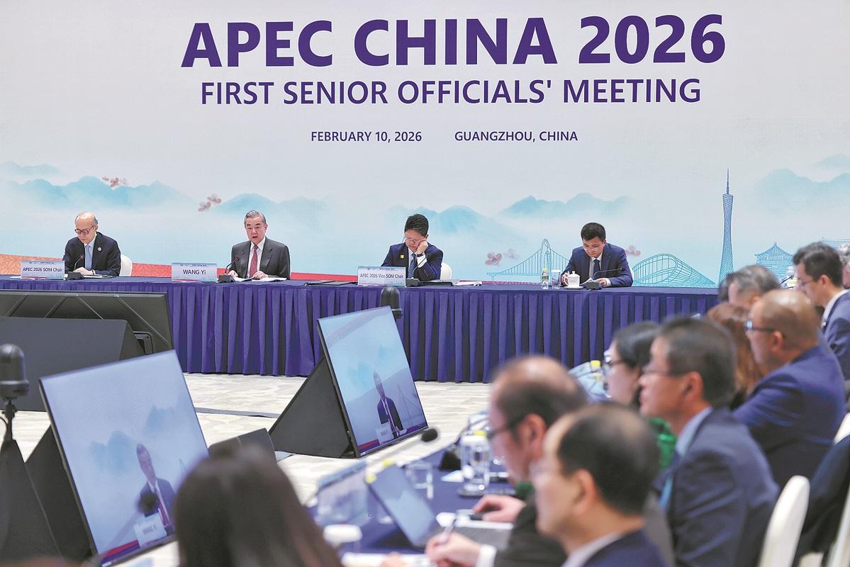 Foreign Minister Wang Yi (center) attends the opening session of the First Senior Officials' Meeting of APEC China 2026 in Guangzhou, Guangdong province, on February 10. (Photo by Zheng Erqi from China Daily)