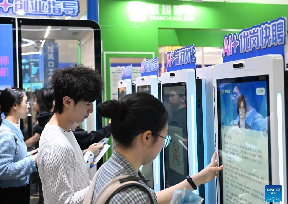A job seeker learns about recruitment information during a job fair in Guangzhou, South China's Guangdong province, March 15, 2026. The job fair kicked off here on March 15, with the participation of more than 2,000 employers and providing about 85,000 jobs. (Xinhua/Deng Hua)